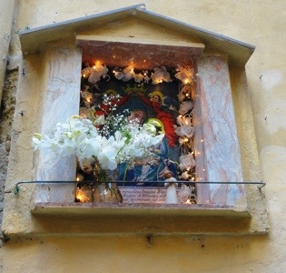 Oh my! Lovely readers, I can hardly contain myself! From the simplest to the most elaborate, did you know that there are countless shrines peppered throughout Italy – on exterior walls, in Grottos in the squares, along obscure pathways and by busy main thoroughfare. I love the thrill of finding them. Each one unique in both detail and the loving and devout attention bestowed upon them. Most I’ve found so far have been devoted to the Virgin Mary though various saints are also honored. I am now on a mission to capture more, camera at the ready…meanwhile enjoy those I’ve found thus far…